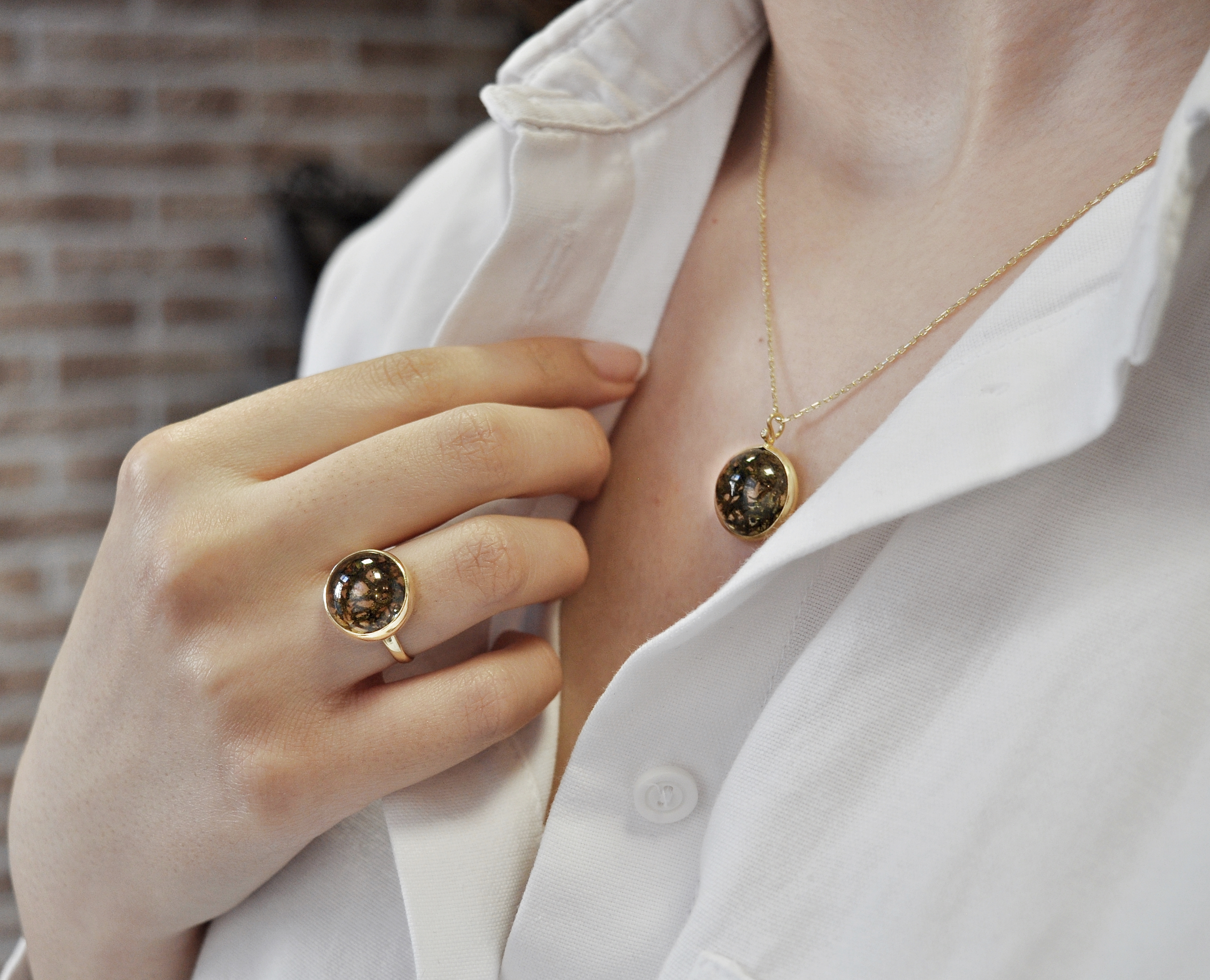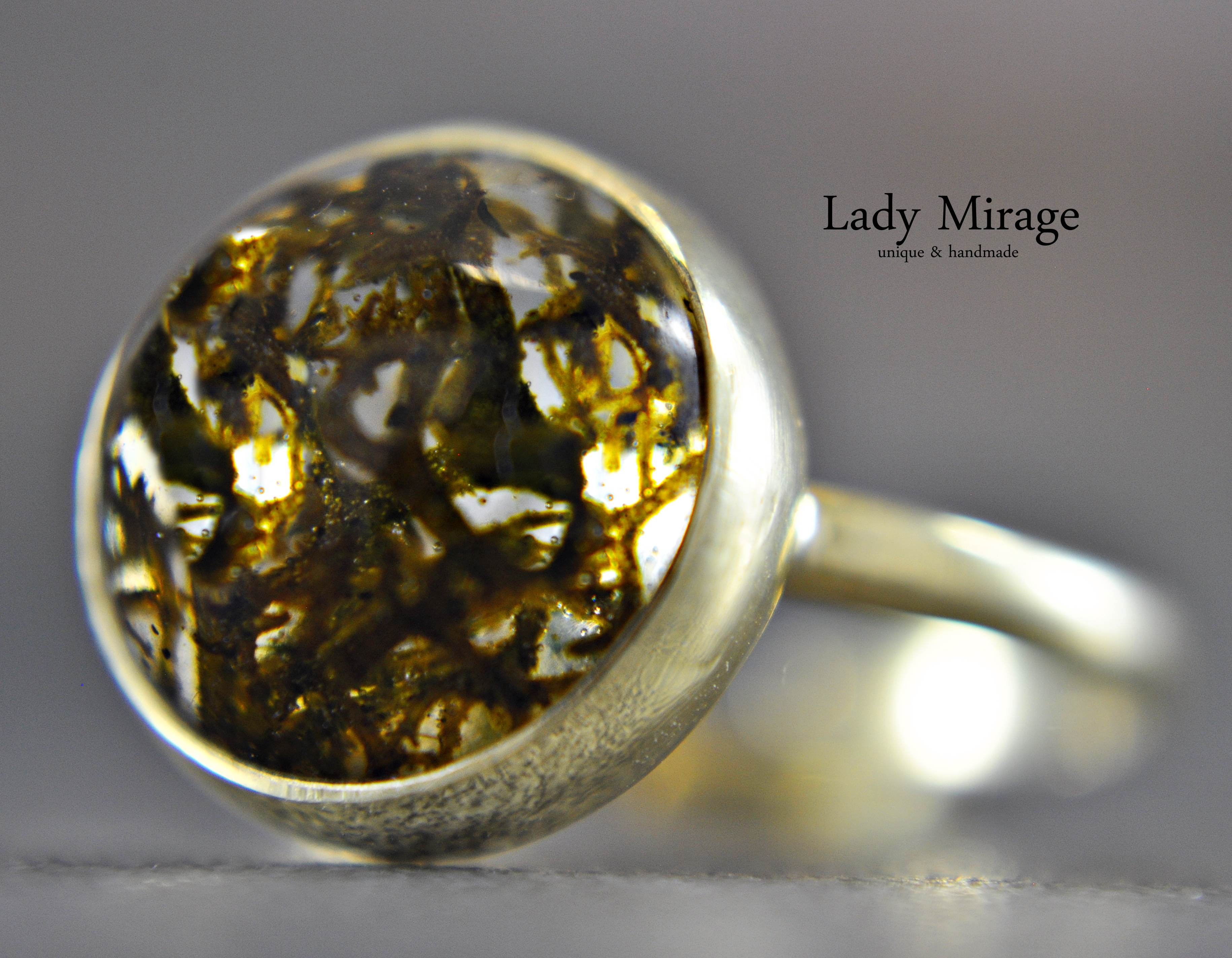 Bezaubernder Ring aus handgefertigten Harz- Cabochons mit echtem Moos besteht aus 925 Sterling Silber und ist in Rahmen eingebettet.