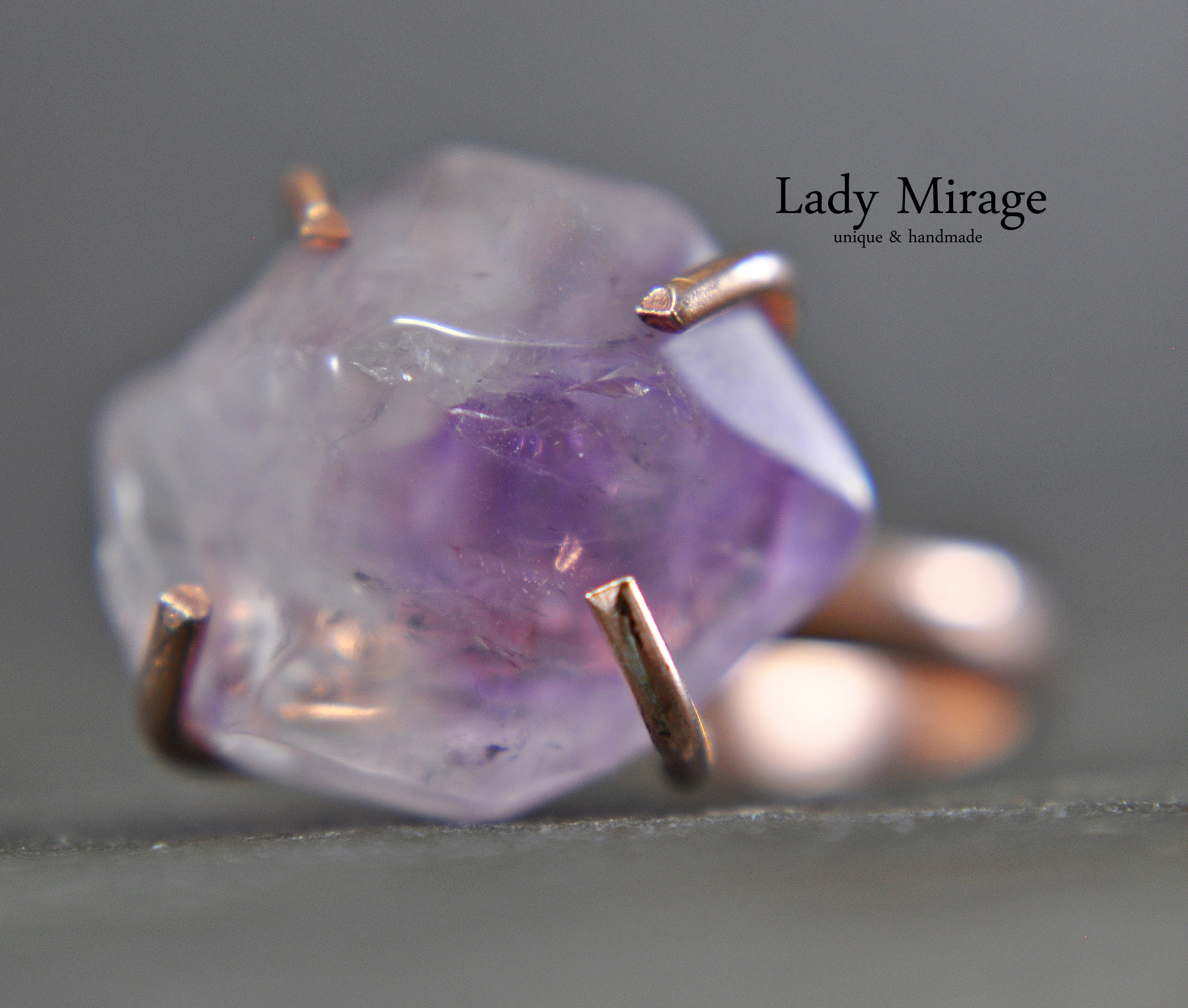 Ein herausragender Amethyst- Rohstein Ring, welcher aus rosévergoldetem 925 Sterling Silber angefertigt wurde. Die natürliche Verarbeitung des gebrochenen Steins leitet dazu, dass jedes Schmuckstück ein Unikat ist.